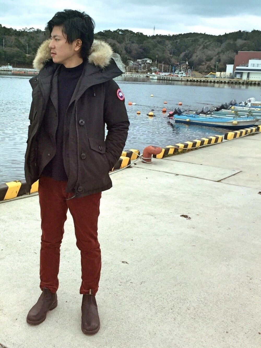 今年ラストコーデ! 海に来たので、グースパイセンにコーデュロイのパンツ(°_°) パイセン暖かすぎて(´ω`)