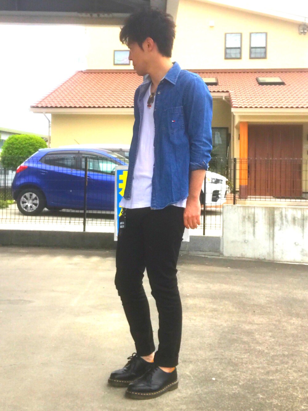 こんばんは〜。 デニムシャツがカジュアルなので、ドクターマーチンのブーツでカジュアルダウンさせてみました🌟