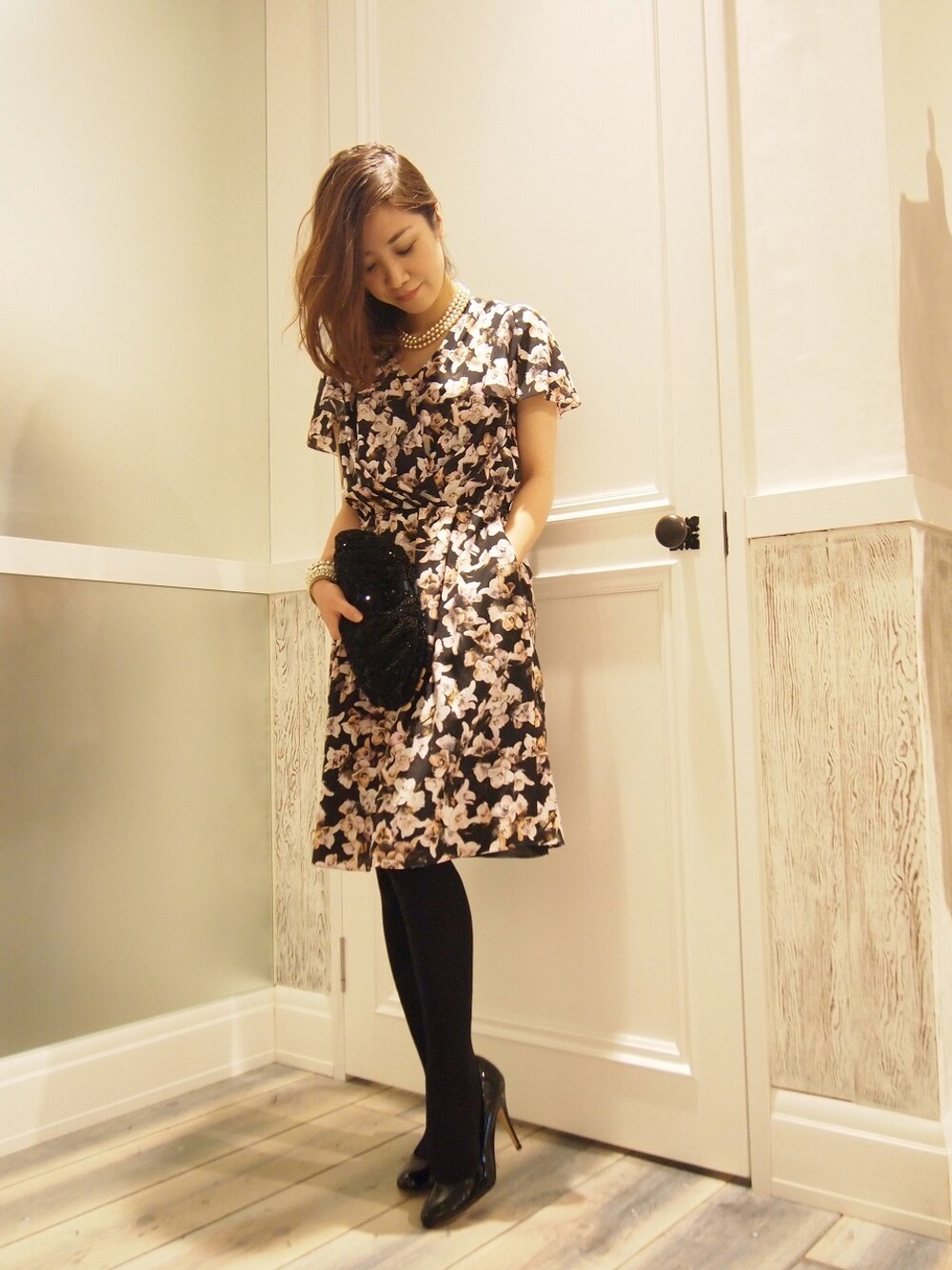 ブラックの地にフラワープリントを施すことで甘すぎない雰囲気に。 1枚で様になるので、小物はブラックで合わせて。