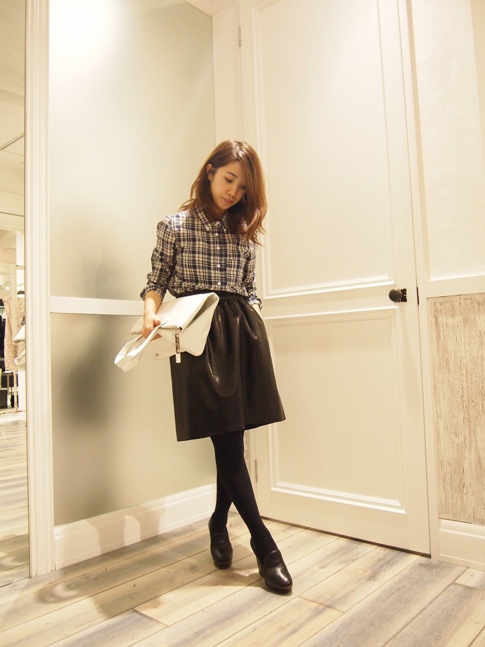 コンパクトなチェックシャツにフレアのレザースカートを合わせて。
