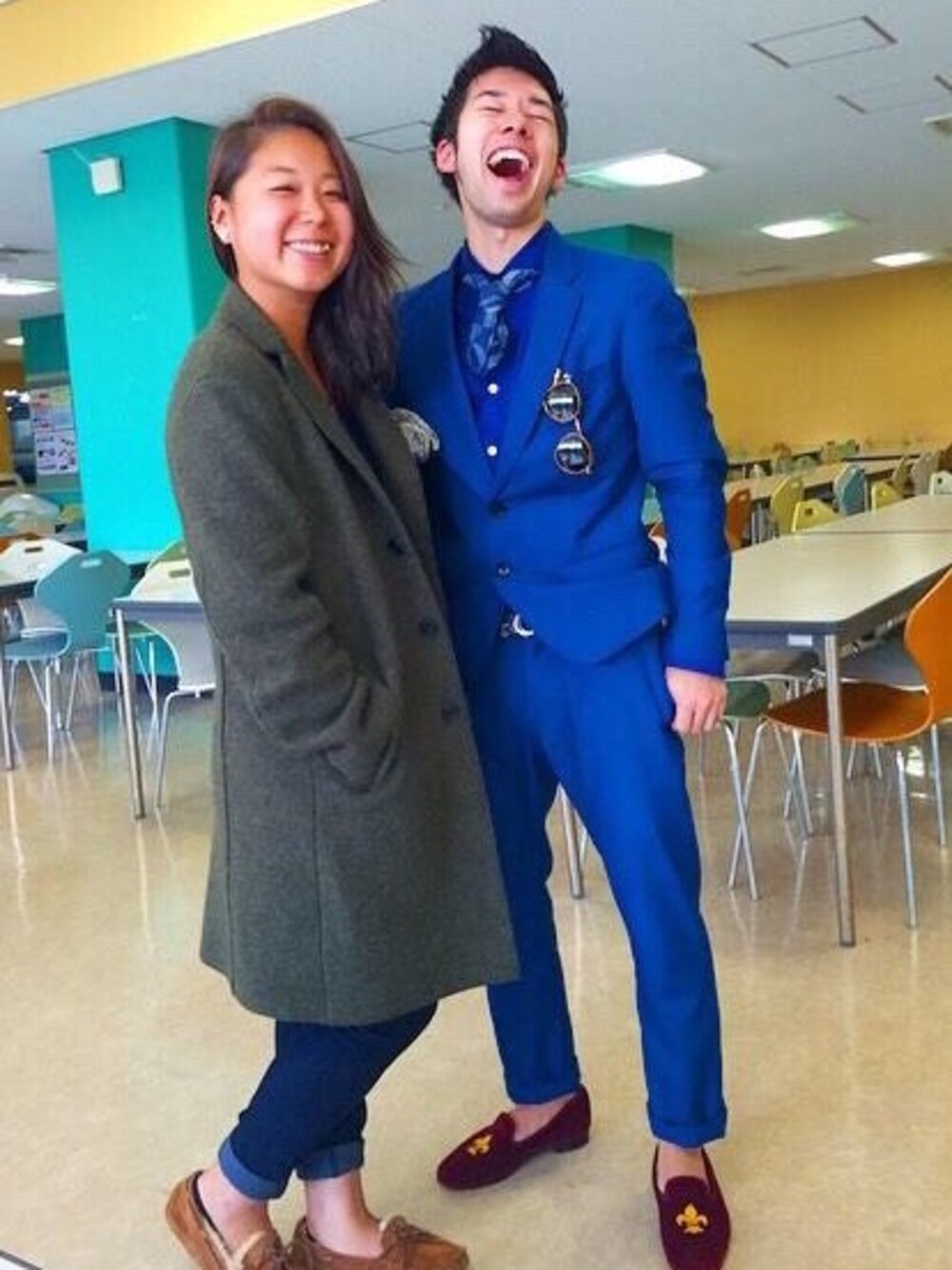 AllBlueで纏めました。 Blueのグラデーションを意識してアクセントで赤のルームシューズを取り入れました。 女の子が着てるコートも僕のです。