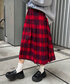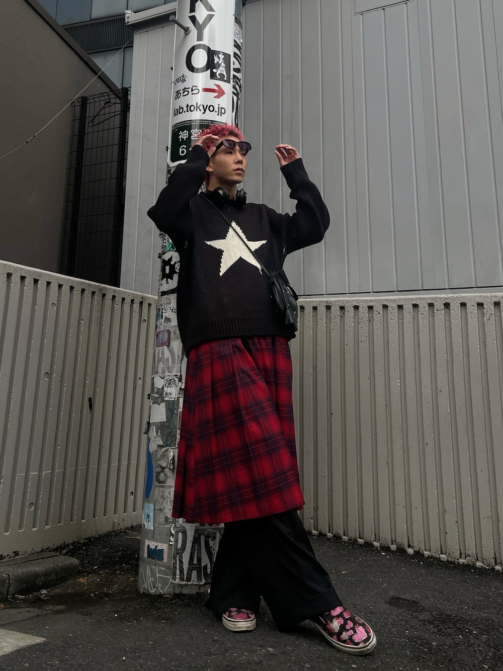 ニットとパンツを黒で揃えて、スカートとシューズで赤系を差し込んでみました。 海外っぽい雰囲気のあるこの合わせは他のカラーでも出来るのでおすすめです。