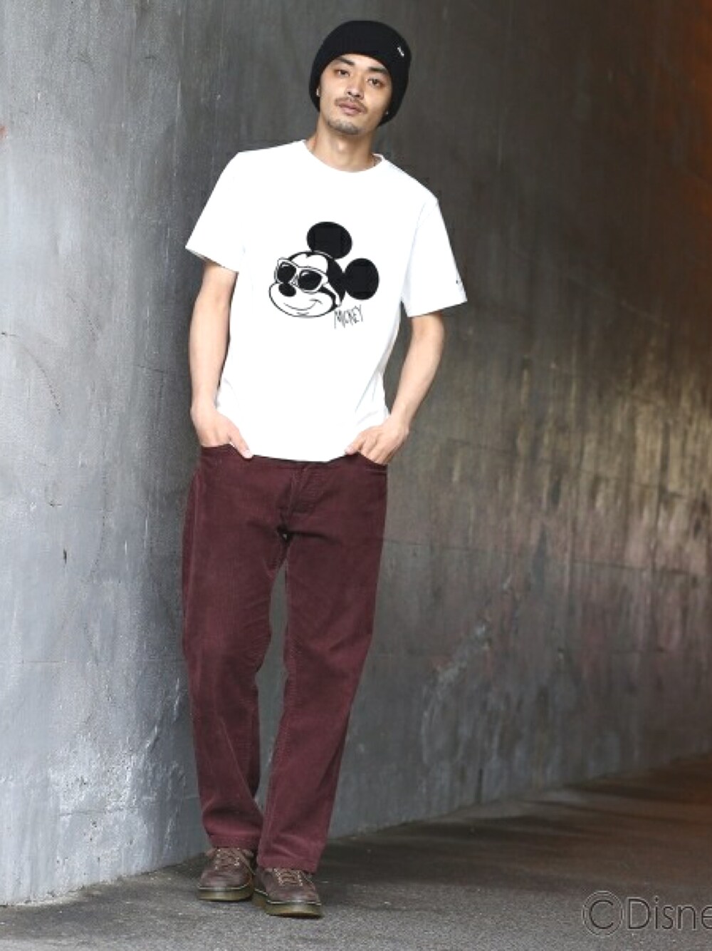 ミッキーのグラフィックTシャツをメインにカジュアルにスタイリング。