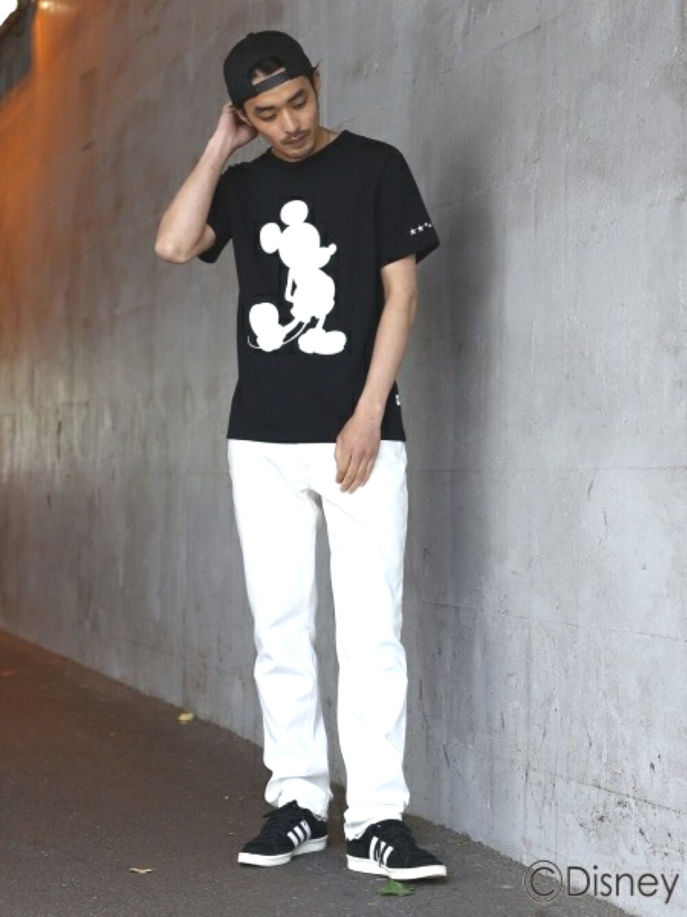 ミッキーのプリントが大胆にされたグラフィックTシャツを軸にモノトーンコーディネート。