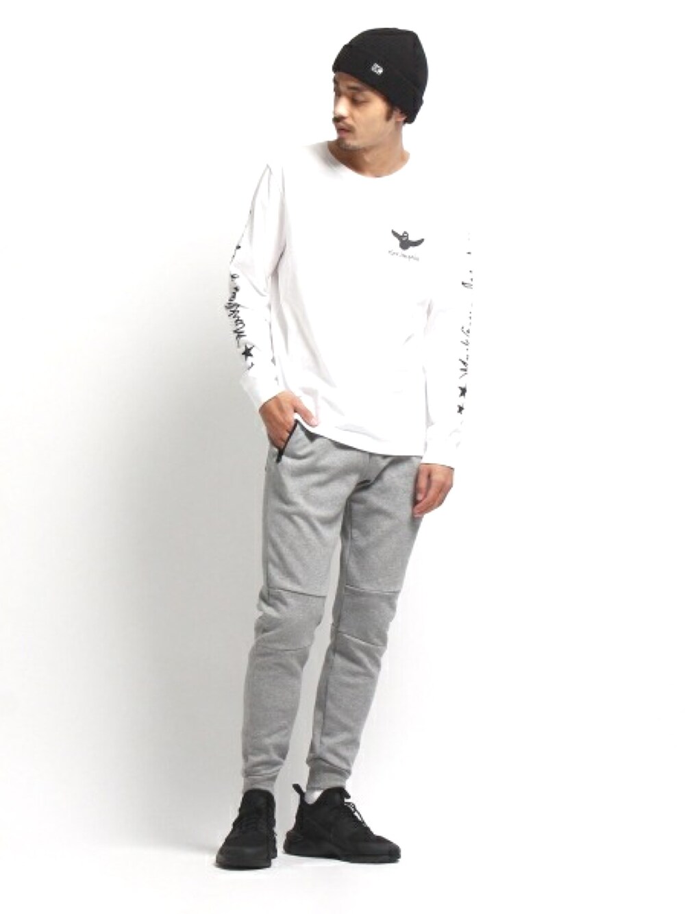 マークゴンザレス別注のロンTを軸にスポーツスタイルにコーディネート。 ダンボール素材のスウェットパンツは肉厚で膝が出にくいため、重宝します。