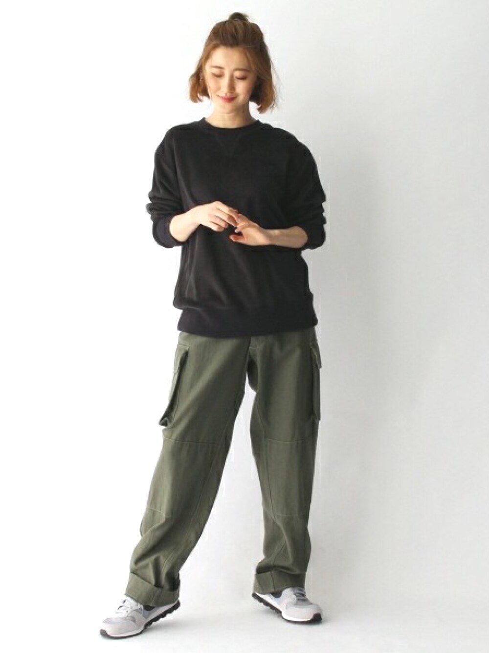 毛足があり、光沢感が今年らしい雰囲気のスウェットを軸にスタイリング。 太めのカーゴパンツを合わせて、ラフな印象に。