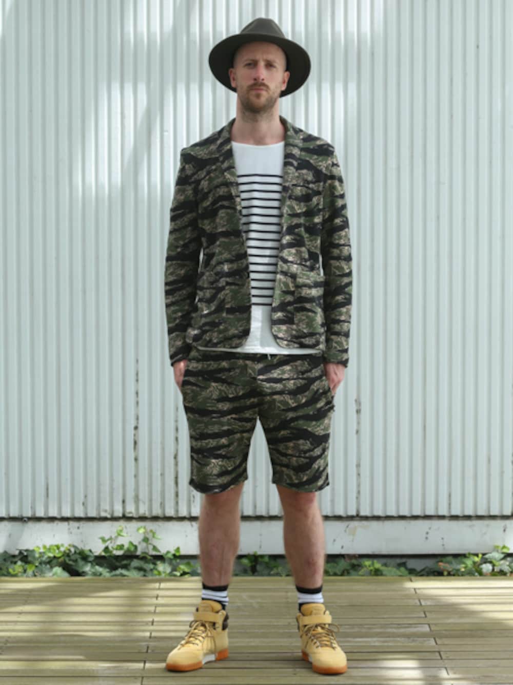 アーバンミリタリーをテーマにタイガーカモのスウェットジャケットとショートパンツ のセットアップ。オリーブのフェルトブリムハットで今年らしさをプラスしてます。