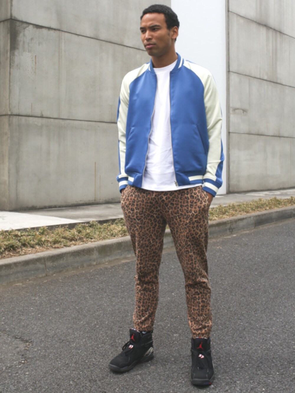 ストリートのイメージで青のスカジャンを軸にコーディネートしました。 スカジャンはリバーシブルで気分によって使いわけられます。 レオパードのパンツはテーパードがかかっているアンクル丈でボリュームのあるスニーカーとの相性もいいです。 supremeの雰囲気で色味を選びました。