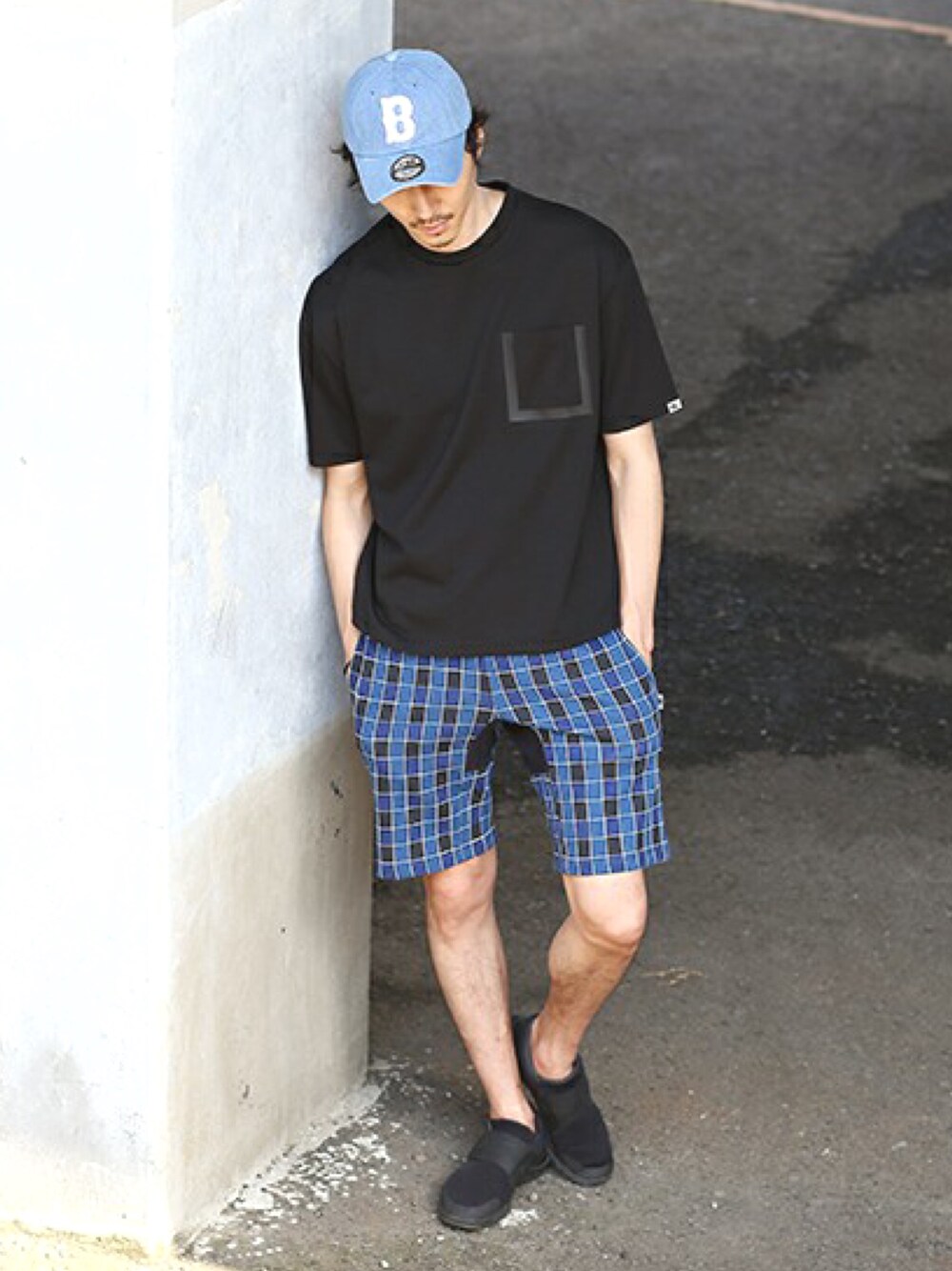 トレンドのローキャップを取り入れたスタイリングです。 T-シャツはビックシルエットでポケットにワンポイント入っております。 シンプルな中にもワンポイントのアイテムは夏場のマストアイテムとなりそうです。