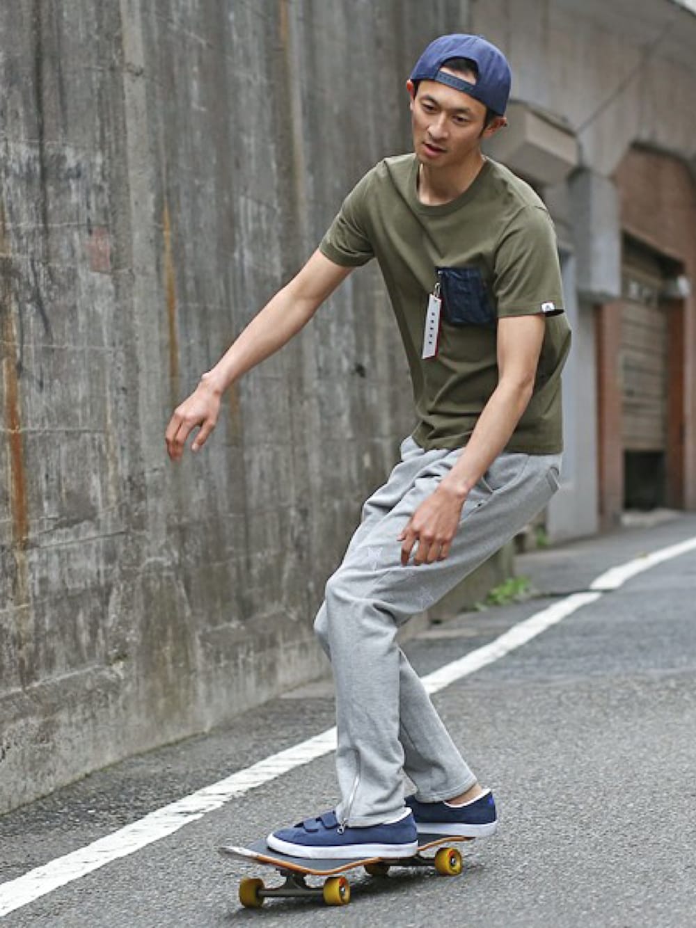 ベースコントロール別注のalphaを軸にスタイリング。 カーキ色のT-シャツはネイビーやグレーとの相性も良いです。