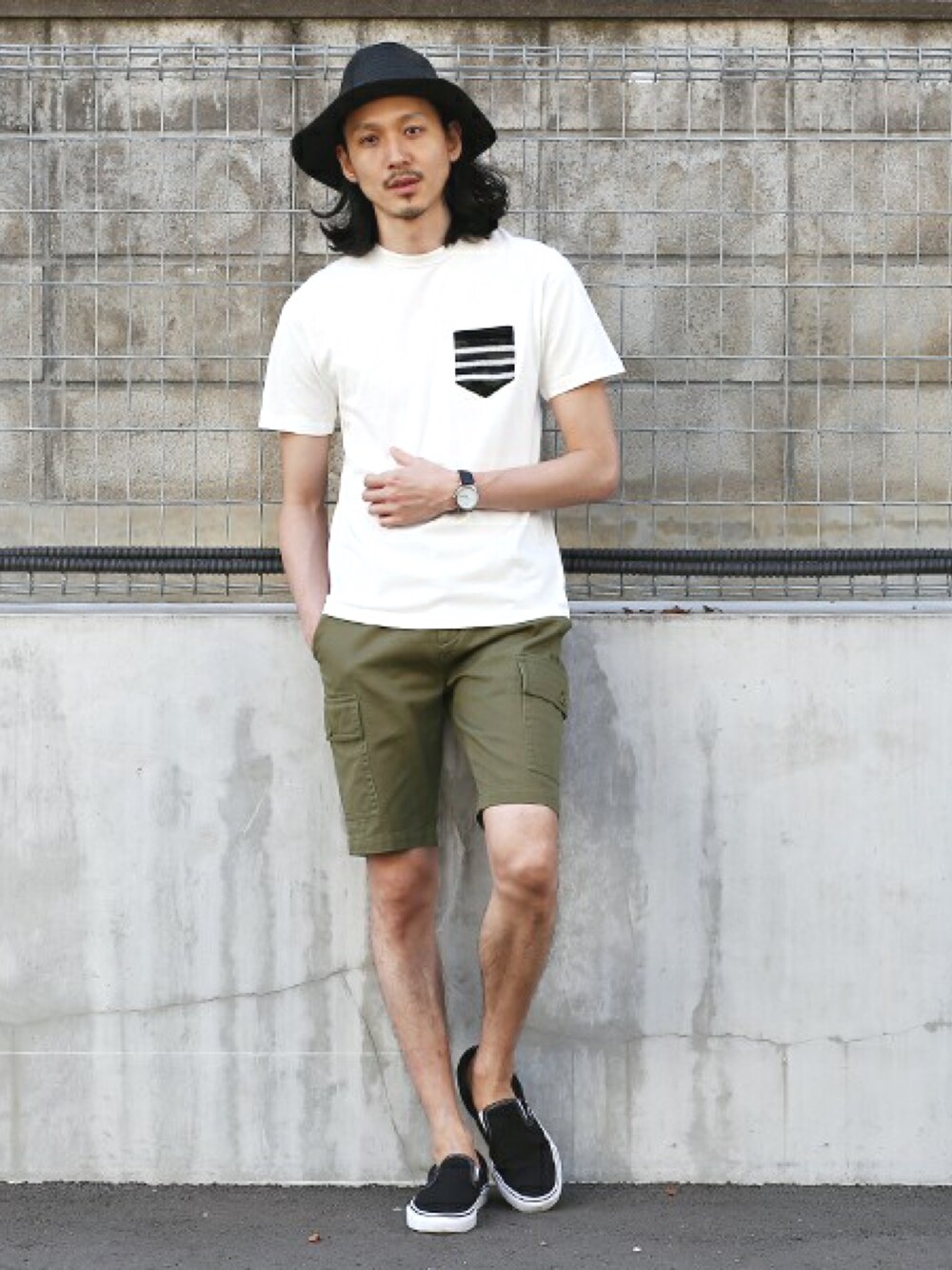 さりげなくポケットが迷彩のT-シャツはワンポイントに加えたいときに最適なアイテムです。 ショーツはカーゴをチョイスし、トレンドのミリタリーテイストを表現しました。