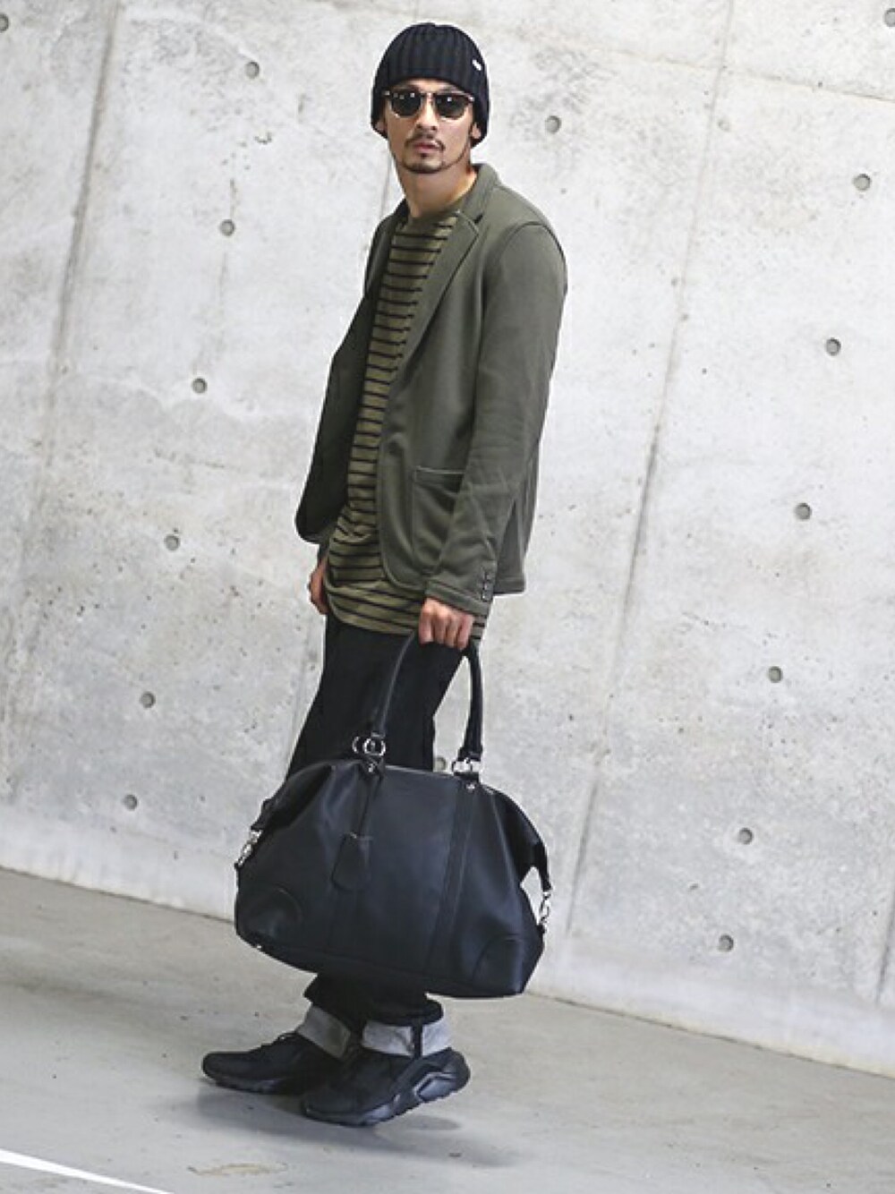 カーキとブラックの色味で統一し、男らしい雰囲気に。