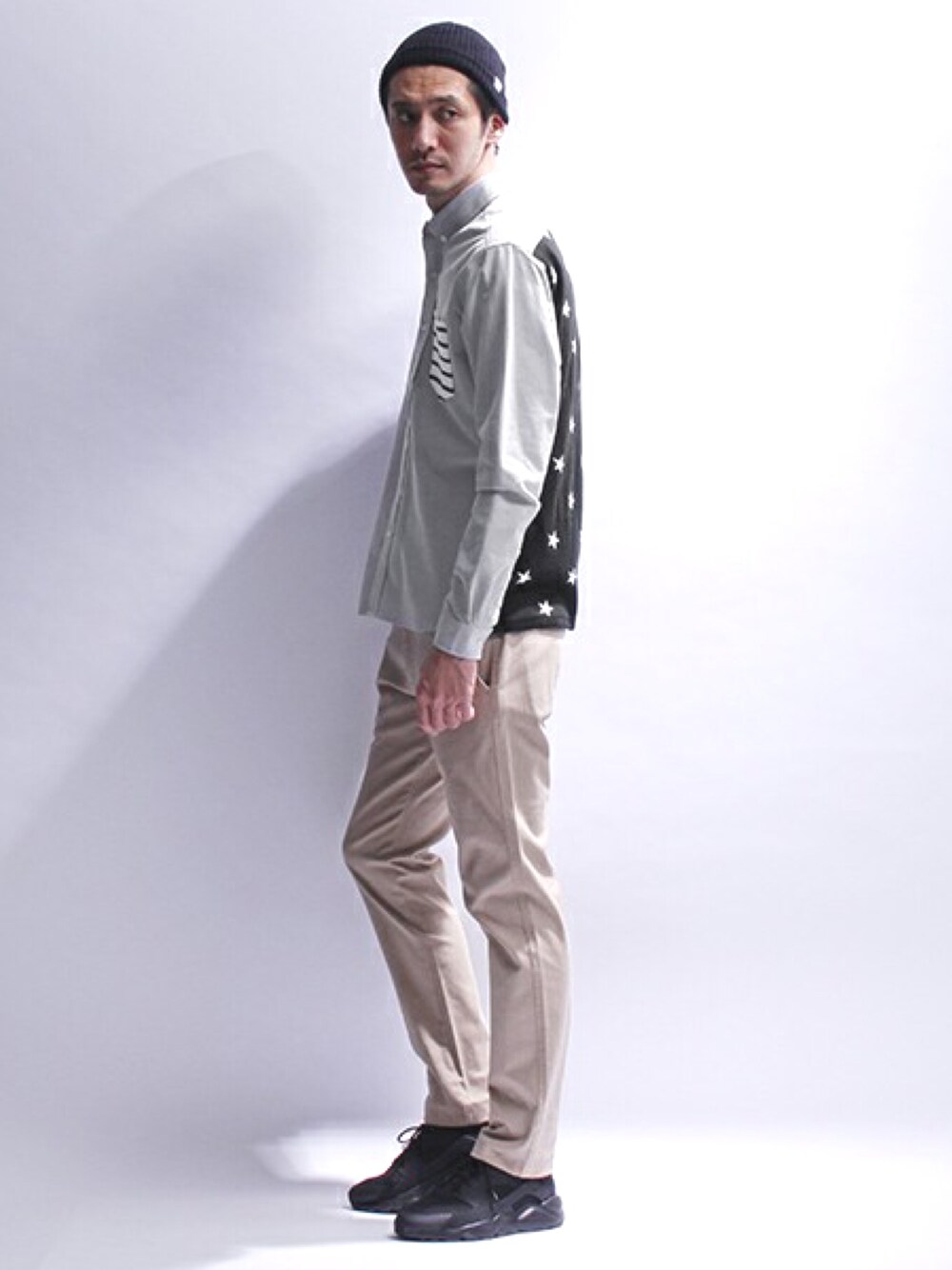 カジュアルにシャツとチノパンでスタイリング。ブラックの小物でスキッリとした印象に。