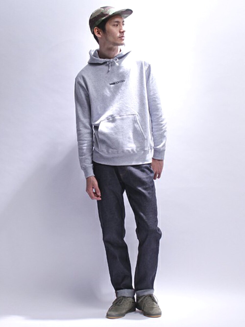 ロゴパーカーを軸にストリートの雰囲気でスタイリング。デニムとの相性が良く、ジェットキャップでよりストリート感を出しました。