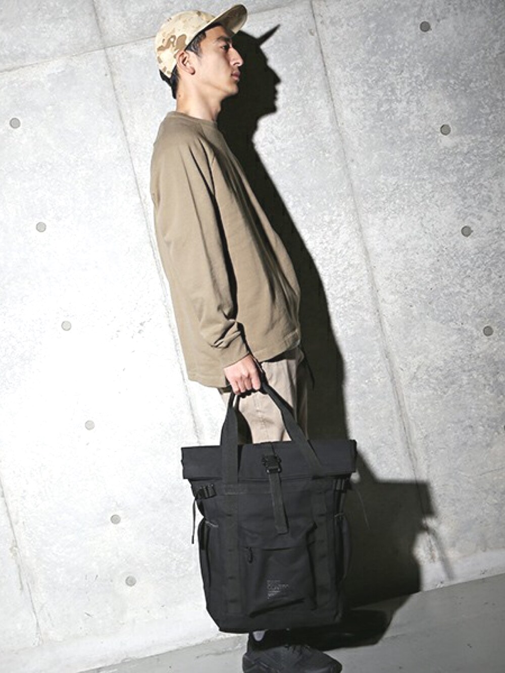 ベージュ系の色味で統一し、春らしくスタイリング。トートバックはバックパックにもなる2way仕様で、非常に便利です。