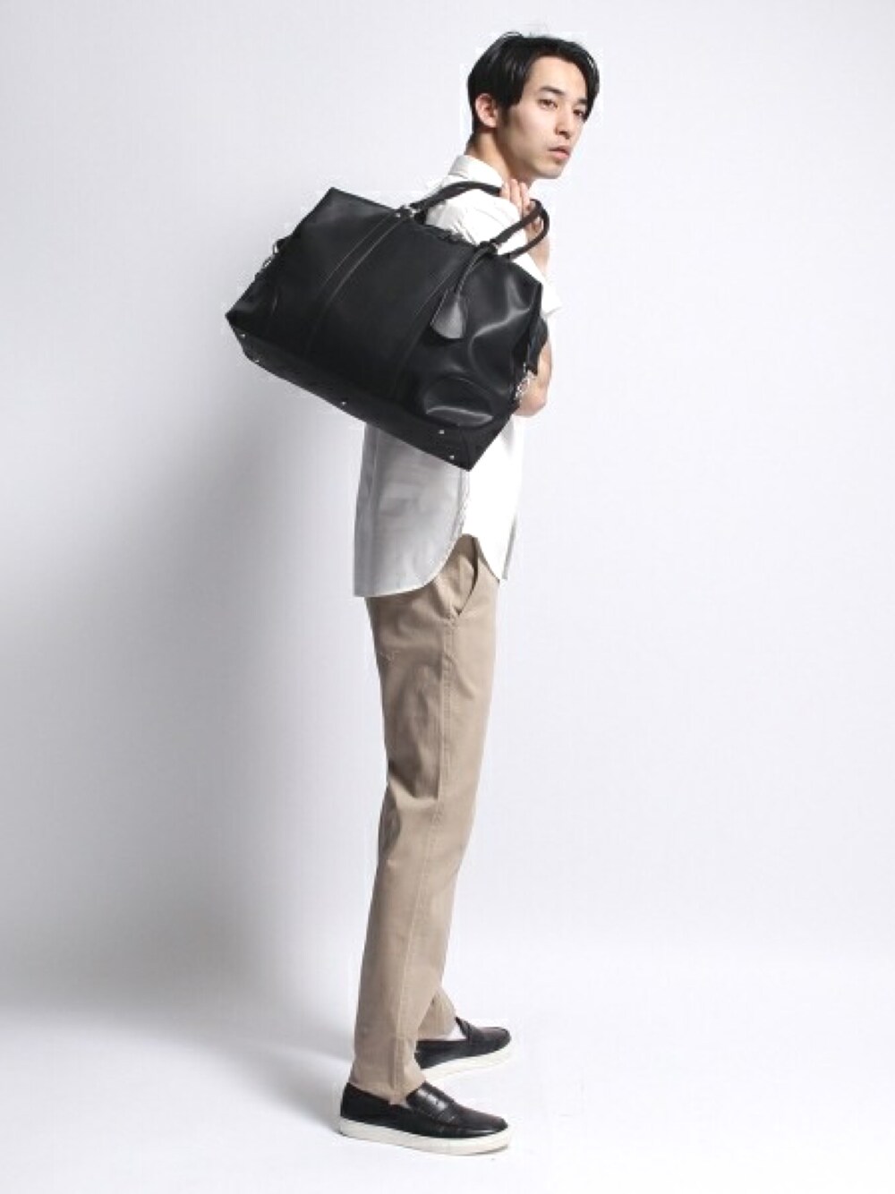 カジュアルに白シャツとチノパンでスタイリング。ボストンバッグは容量も大きく、使い勝手がいいです。