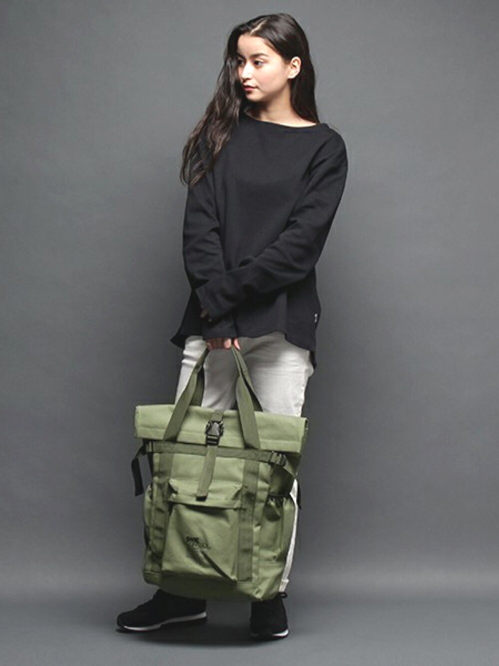 トップスはあえてメンズのMサイズを選び、今年らしくゆるい雰囲気に。トートバックはリュックにもなる2way仕様で優れものです。