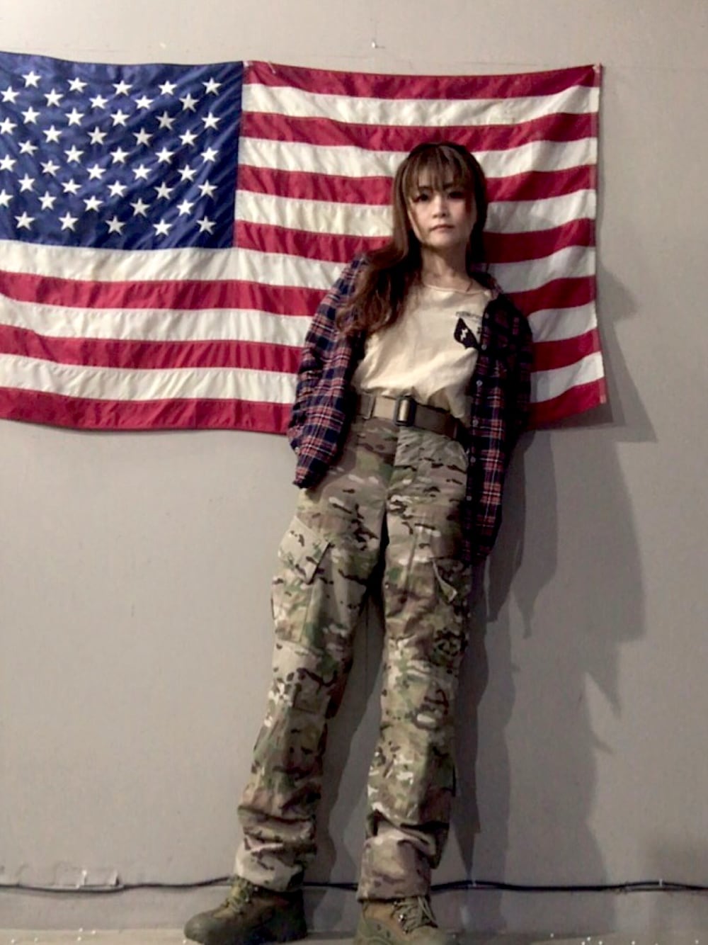 チェック+マルチカムのパンツを合わせるのが可愛い😍 インナーは私オリジナルのTシャツ