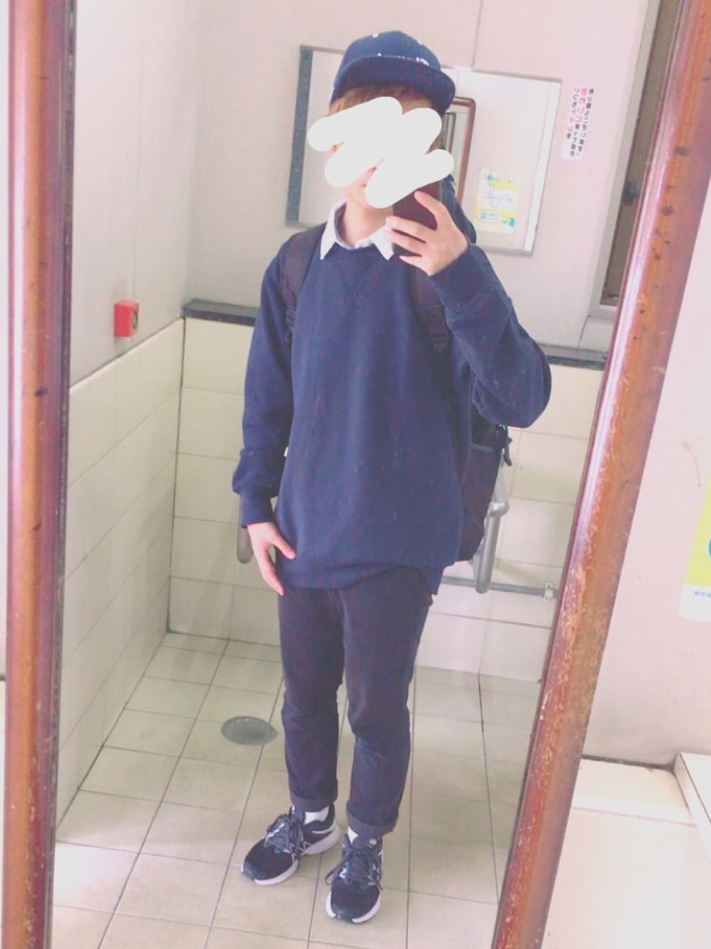 スウェット×シャツは安定 そんでもってネイビー×黒は安定 つまり安定 こんな大学生よくいる