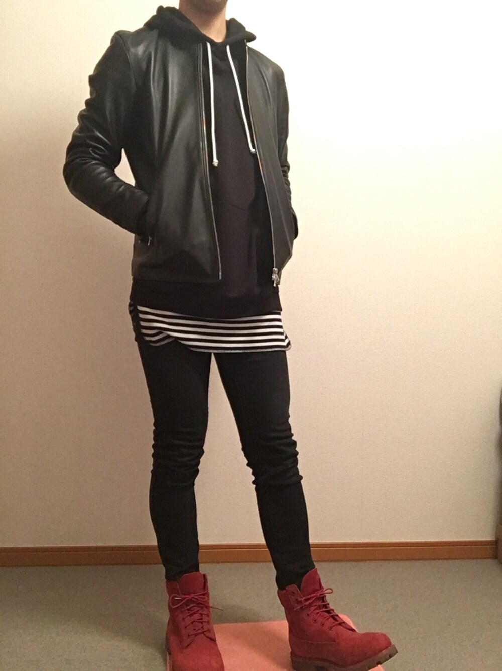 いつもいいね等ありがとうございます😊 本日はパーカーにレイヤードして、上にライダースを着てました👍 全体的に黒っぽくなりすぎず個人的にはかなり気に入ってます! ティンバーランドの赤良きです。 もしよければいいね、セーブ フォロー、コメントの方お待ちしております! 他のコーデもよろしかったら見て行ってください!