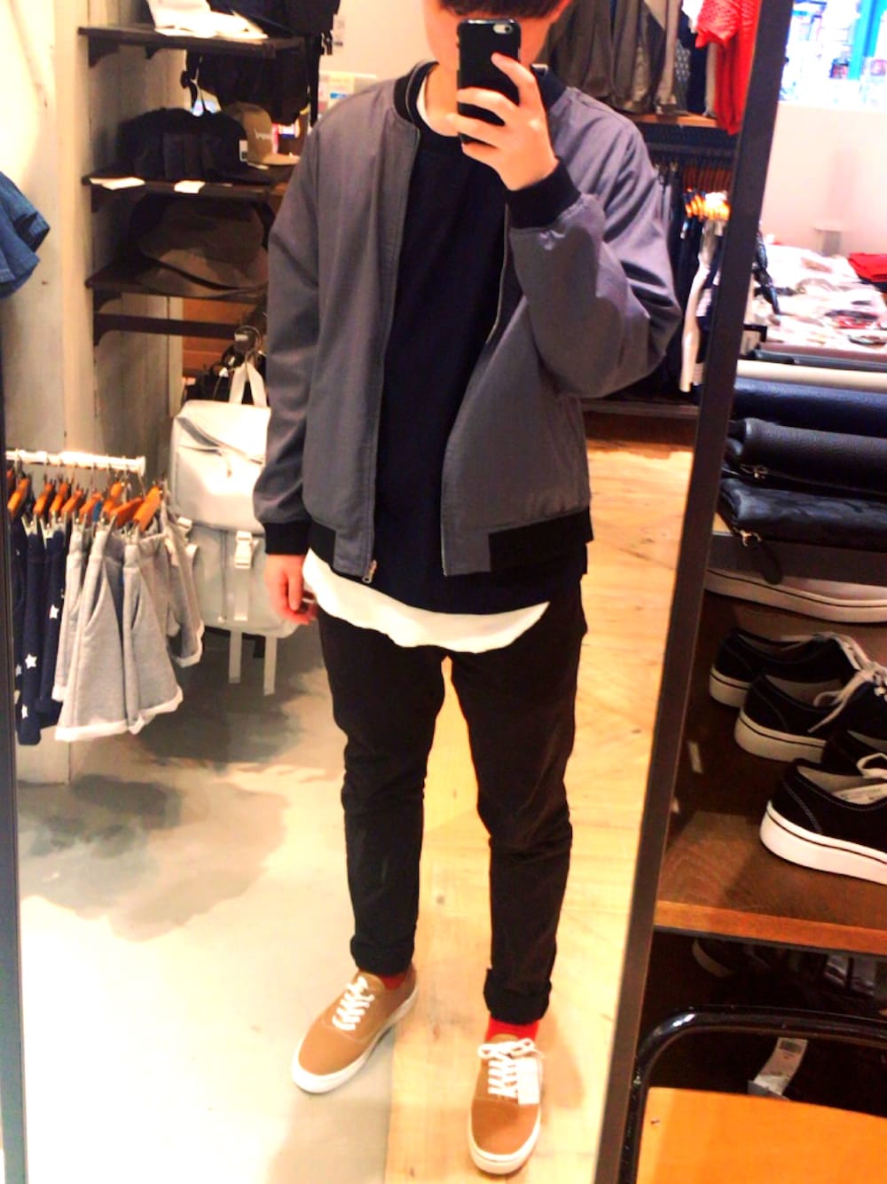 春の寒い日のコーデ! ブルゾンを脱げばネイビーのカットソーに 白のレイヤードといった春らしいコーデになります
