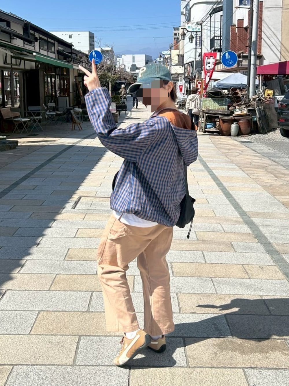 レイヤードで抜け感!インナーの白を ちょっと出すことで重くなりすぎやん☝️