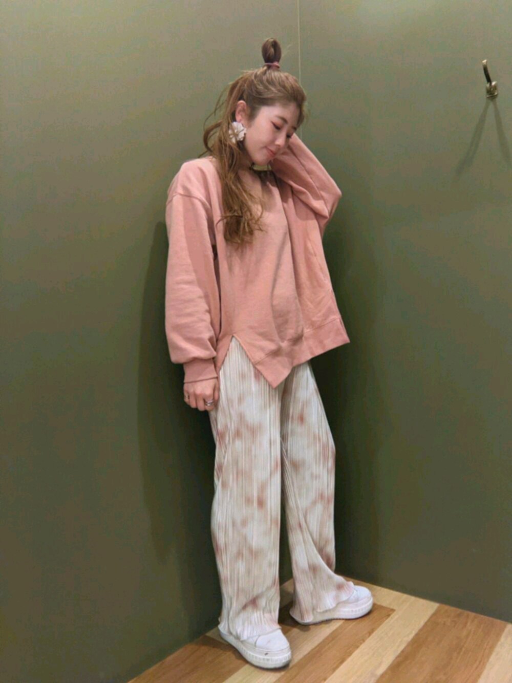 PINKTONE ダイタイ柄パンツのトーンに合わせてスウェットもピンクで! スウェットは裏起毛でまだまだ寒い春の味方です! 色味が春っぽいのが季節感出せて◎ 細プリーツのパンツなので脚のラインもひろわずにリラックスして履けますよ!