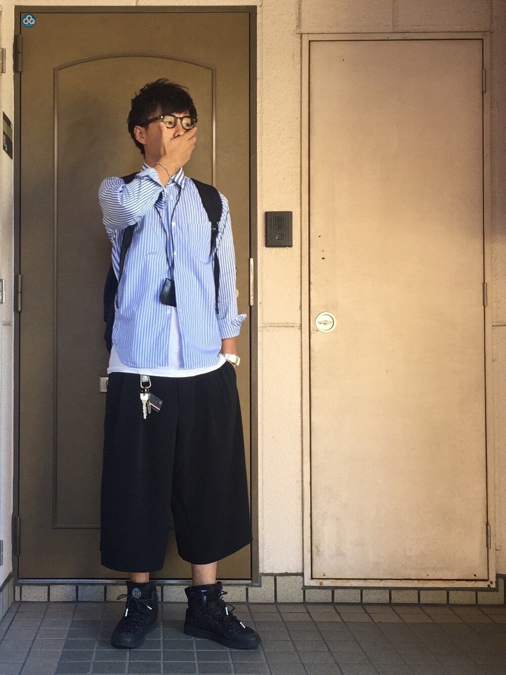 福岡暑い!けど、シャツ好きの自分にはいい気温です。 襟、袖、身頃でストライプが違うお気に入りのシャツと、ユニクロのパンツで。