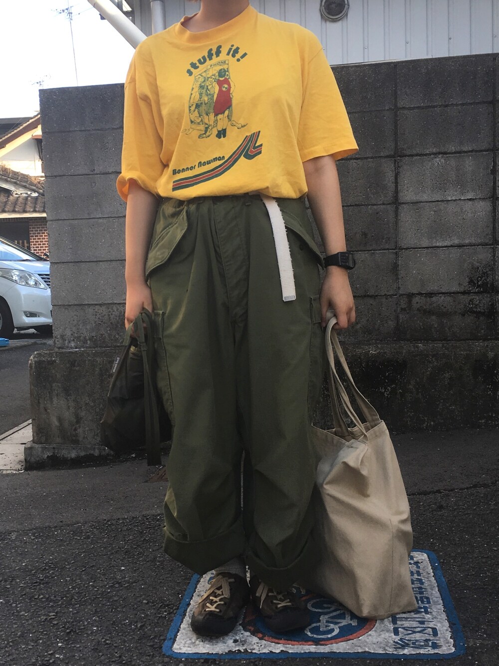 今日の服はかっこよかった〜 m65、やりすぎかな?というくらい折った方がかっこいい、Tシャツもしぶい、生地感が😊✌️