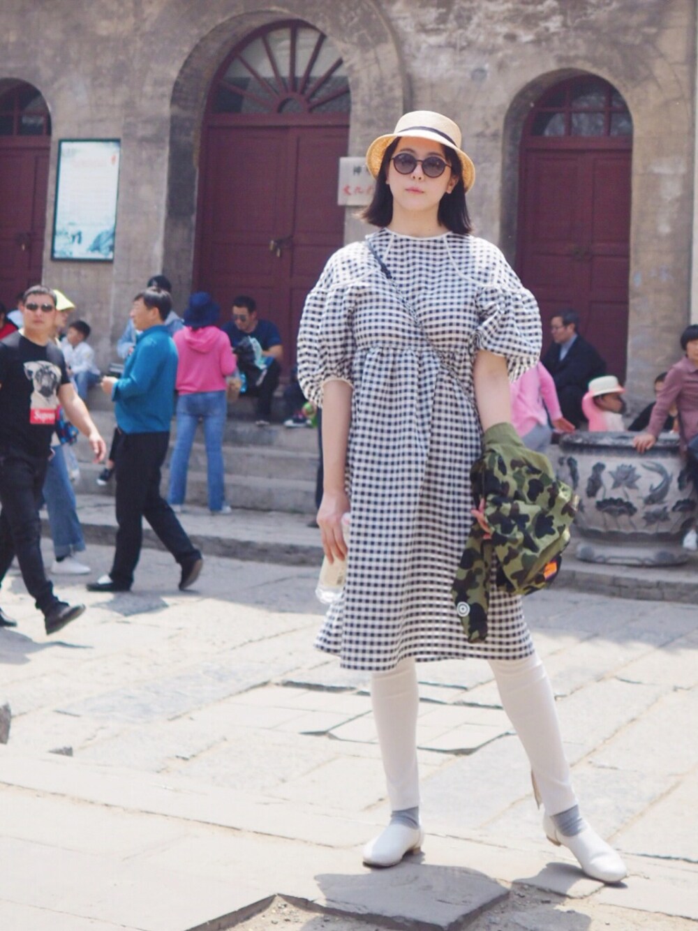 ホワイト系のワンピース、ベージュ系のサンバイザーを着用したレディースの春コーディネートの1枚目の写真