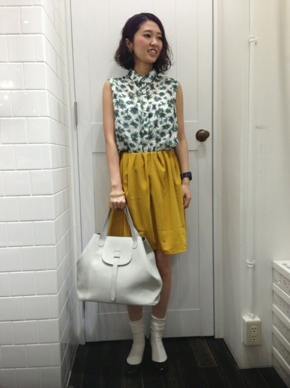 今期トレンドのボタニカル柄に黄色のスカートで初夏の爽やかさをイメージしました。