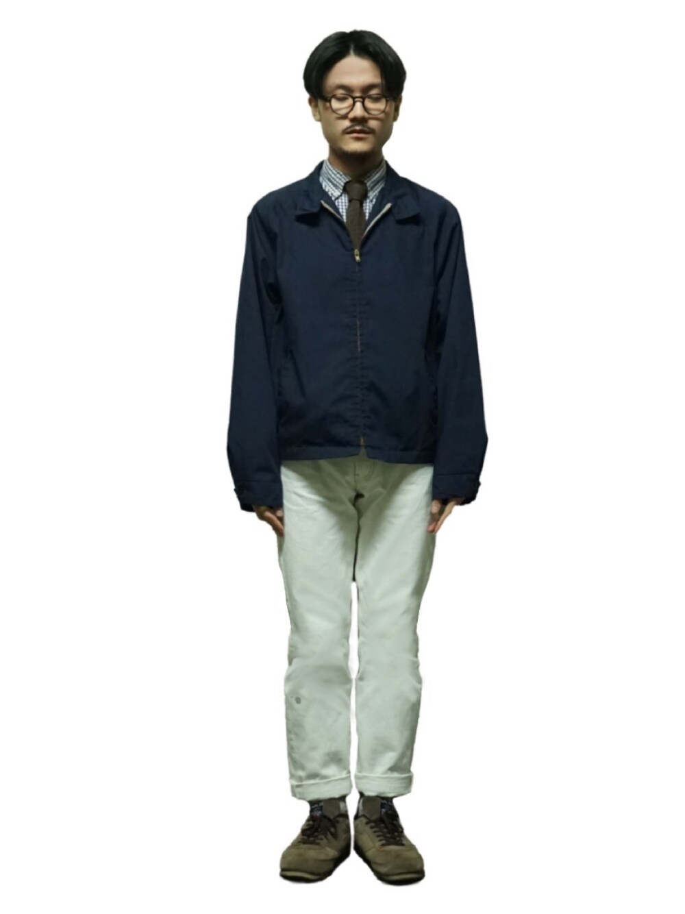 スウィングトップはタイドアップして、敢えての王道。足元はハズしたい。