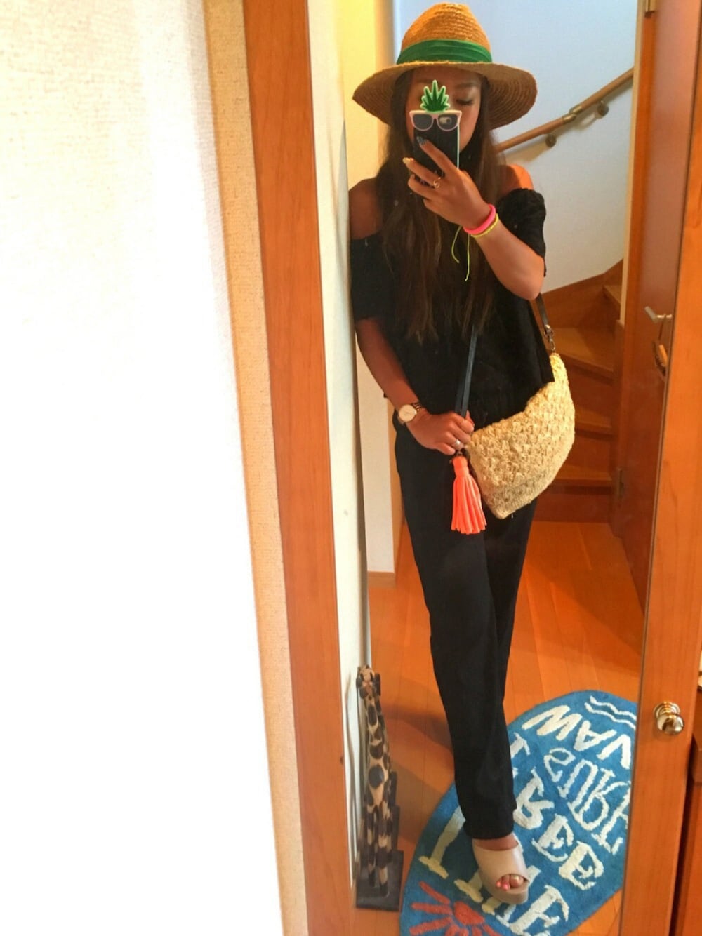 全身ブラックコーデw 麻のパンツは楽チン♡w roomIVYのバックにハンドメイドのタッセルつけましたw