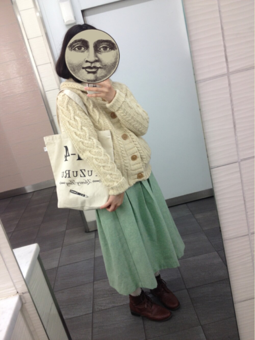 グリーン系のスカートを着用したレディースの春コーディネートの1枚目の写真