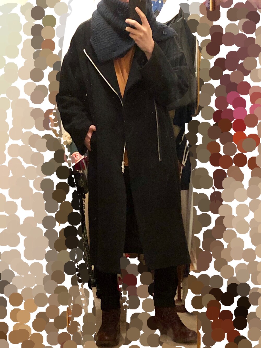 wizzardのノーカラーコートが届いたので早速着ました! ドレープ感のあるザックリとしたシルエットに、ライダースのデザインが一目惚れでした。 インナーのダークオレンジもチャコールとの相性が抜群で、お気に入りのコーディネートです。 首元にボリュームを持たせなくて、今期のネイビーのスヌードも一緒に揃えました!