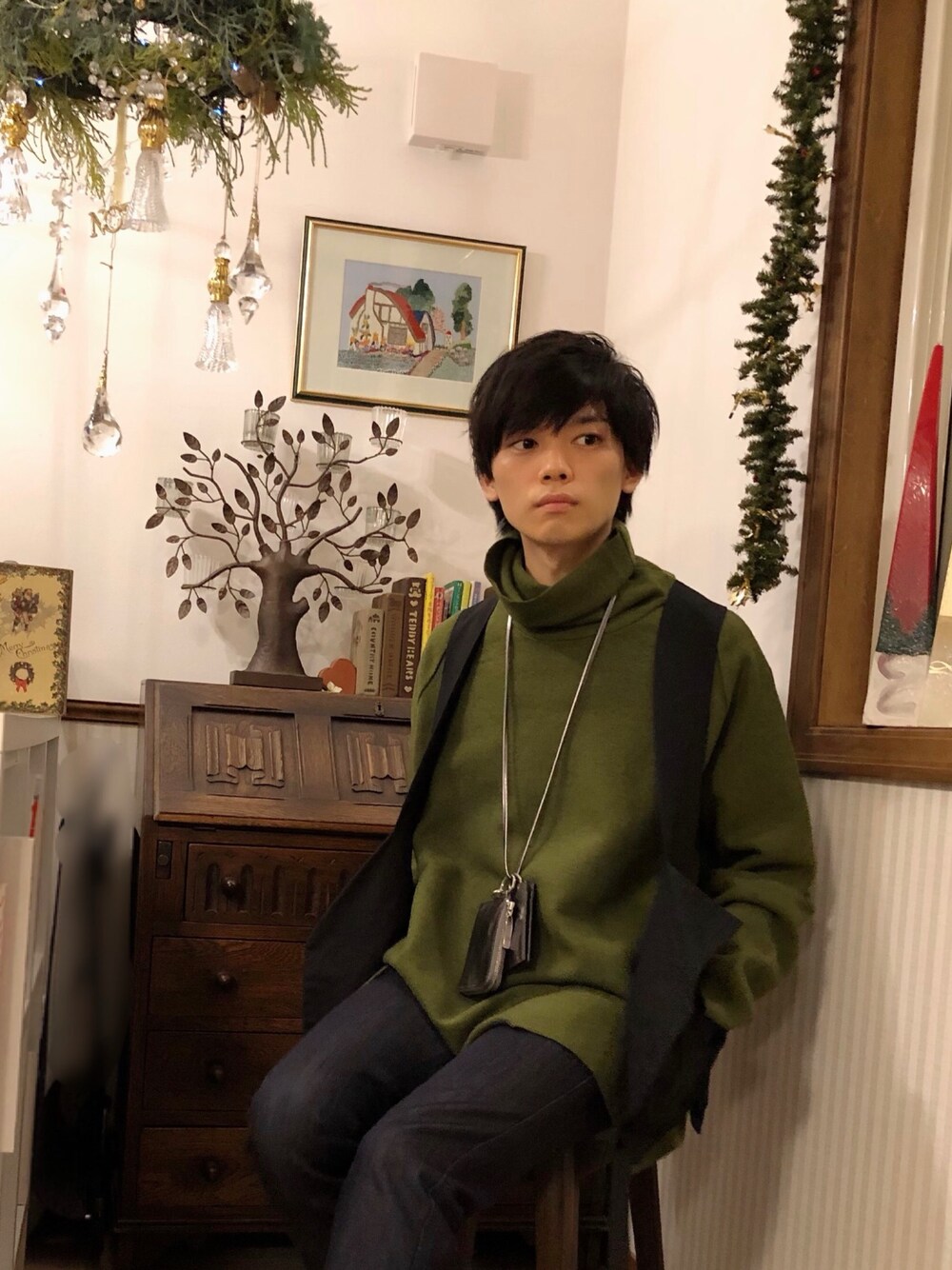 本日はクリスマス仕様の室内を背景に撮影しました。 上に吊るされているリースは、ハンドメイドのオリジナルリースです。 ヒムロスギ、コニファー、ローリエ、クリスマスホーリーなど自然の素材で作られています。 BBツリーでは毎年、ミニツリーとクリスマスリースを作るイベントを開催しています。 ご好評を頂いているイベントのひとつです! ヴォアーブのグリーンのニットとちょうど色味が合っていたので、一緒に撮影しましたー