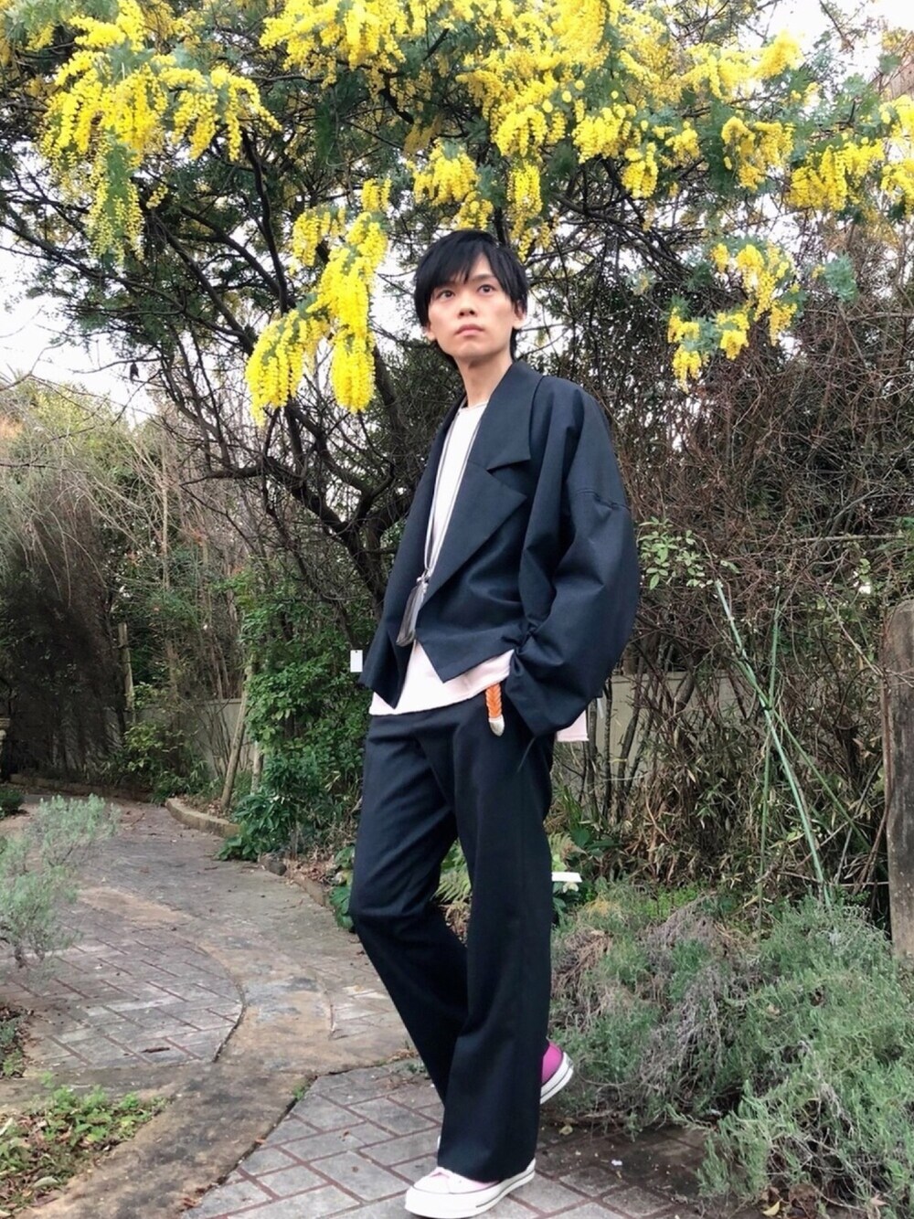 今年一番お気に入りのマイビューセットアップ2枚目です! こちらは2月中に見ごろなミモザを背景に撮影しました! 河津桜に続き、ミモザも開花が早かったです。 こちらの写真では、ワイドジャケットのボリュームと、ブーツカットシルエットが綺麗に写せたかな?と思います。 細くもなければ太くもない絶妙なシルエットがお気に入りです。