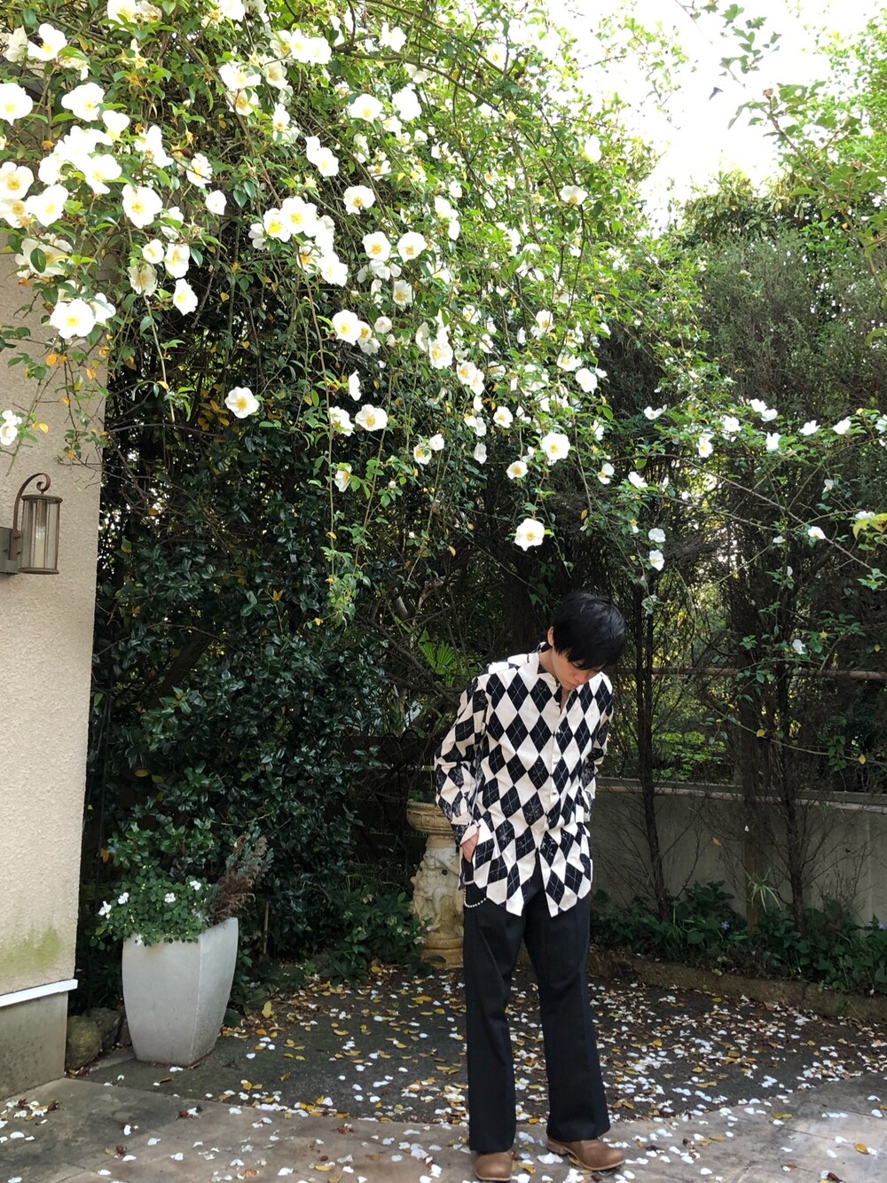 今年も薔薇が綺麗な季節になりました! 花びらのカーペットも綺麗です。 masuのアーガイルシャツにチャコールグレーのフレアパンツで合わせました。 シンプルなコーディネートなので、ウォレットチェーンでアクセントを加えました。 足元はスリッポンでラフに。