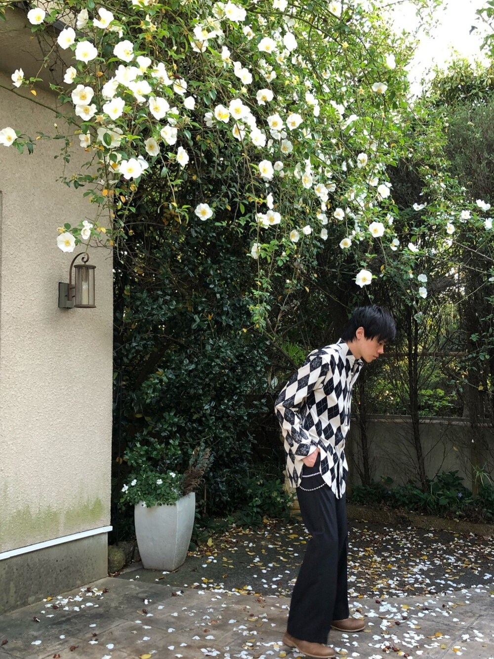 前回と同じ背景を横から! フロッキー素材のアーガイル柄は一つひとつが風合いと擦れ具合が異なるのが魅力です! アームのアーガイル柄は、他の部分より古着感が出ています。 角度によって表情が変わるのも面白いですね。 masuのアーガイルシャツは、ここ最近のシャツで1番お気に入りです! ウォレットチェーンはパールとボールチェーンの2連になっています。 シンプルなコーディネートでは、アクセサリー選びも楽しいですね!