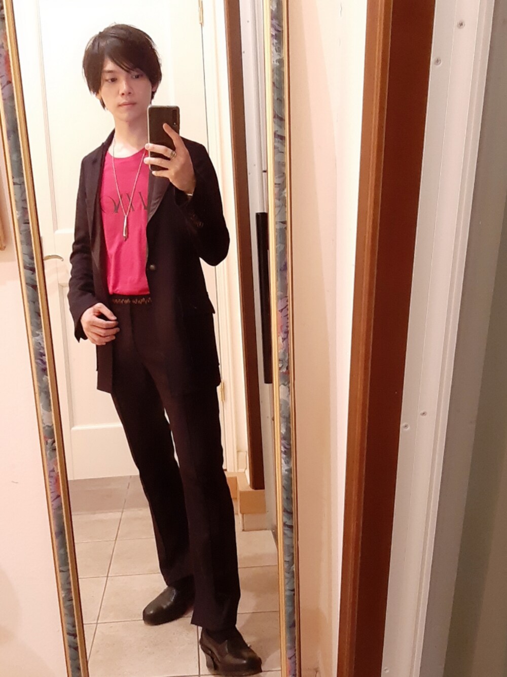 サリバンのピンクのカットソーに黒のセットアップを合わせました。 明るくて深みのあるピンクに一目惚れして購入! 黒のセットアップには、明るい色を差し込んで崩すのが好きです。 丈を出して着ても良いけど、せっかくなのでタックインしてベルトループの刺繍デザインも見せたいですね笑 ジャケットはベッドフォードDISTORTION LAPEL JACKETのシングルタイプです。 パンツも細身のフレアシルエットなので、全体的な印象が引き締まります。