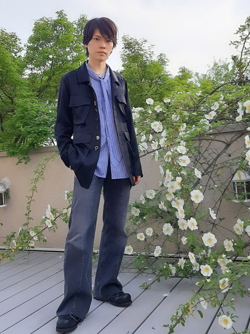 今期はミリタリーブルゾンを購入しました。M65タイプですが、落ち感のある上品なシャツブルゾンに仕上がっています。 ボタンが一つ一つ違うのも面白いアクセントです。 パンツはZaraのZARAのフレアパンツを合わせました。裾が長めで切りっぱなしのデザインなので、細身になり過ぎず程よくルーズなシルエットが気に入っています。 ローライズのフレアパンツは、世代的に懐かしさを感じられる新作でした。 かなり色落ちが入っているので、上下ブラックで合わせても重くなりすぎないのも春コーデでは重宝します。 インナーはブルーのストライプシャツでより軽さを出しました。