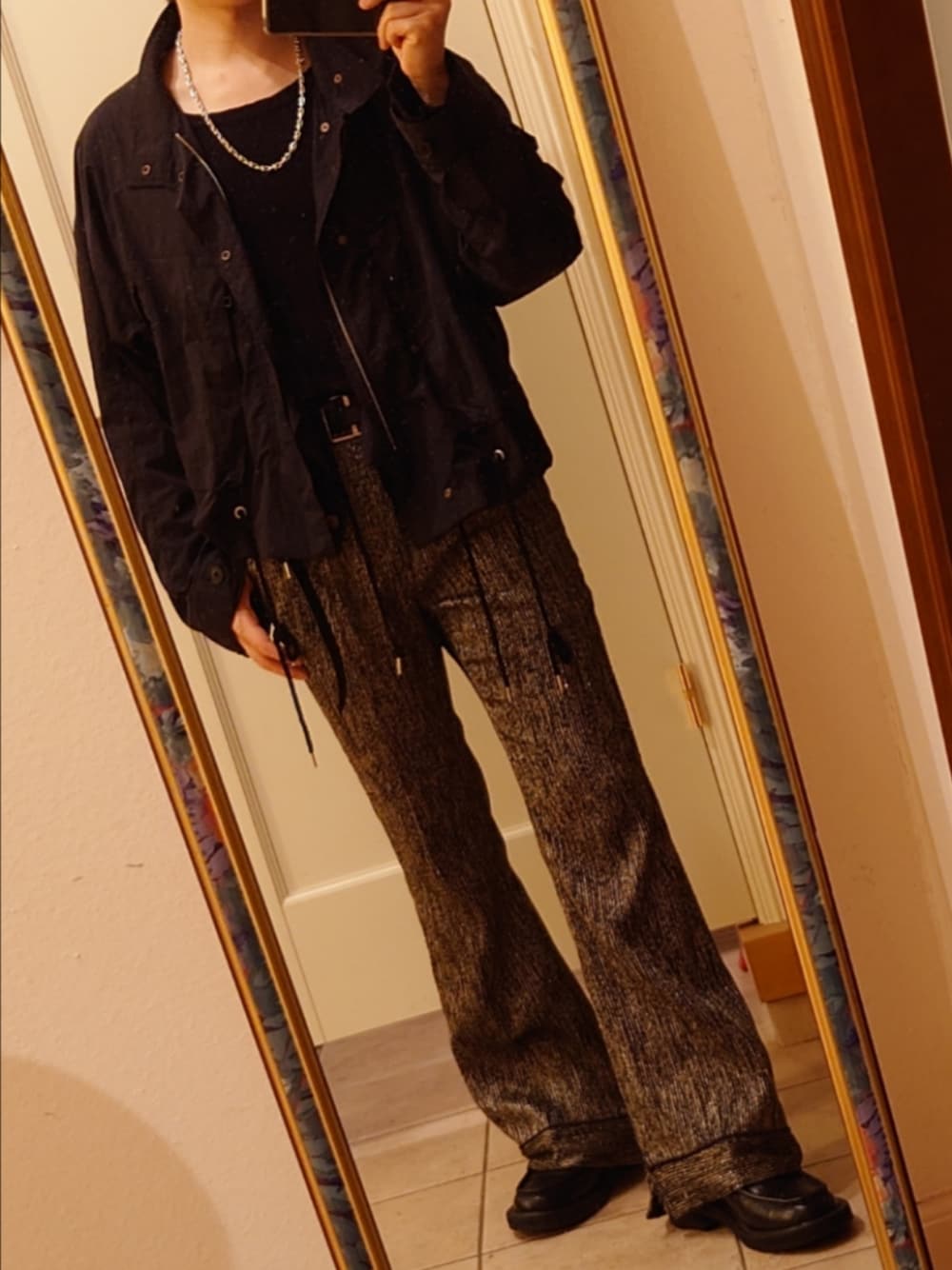 ほぼオールシーズン使えるナイロンショートモッズ。 ブラックとシルバーというモノトーンコーデですが、フレアパンツはラメの光沢があります。 この上からコートを羽織れば真冬のコーディネートが完成するので、大変重宝しています!