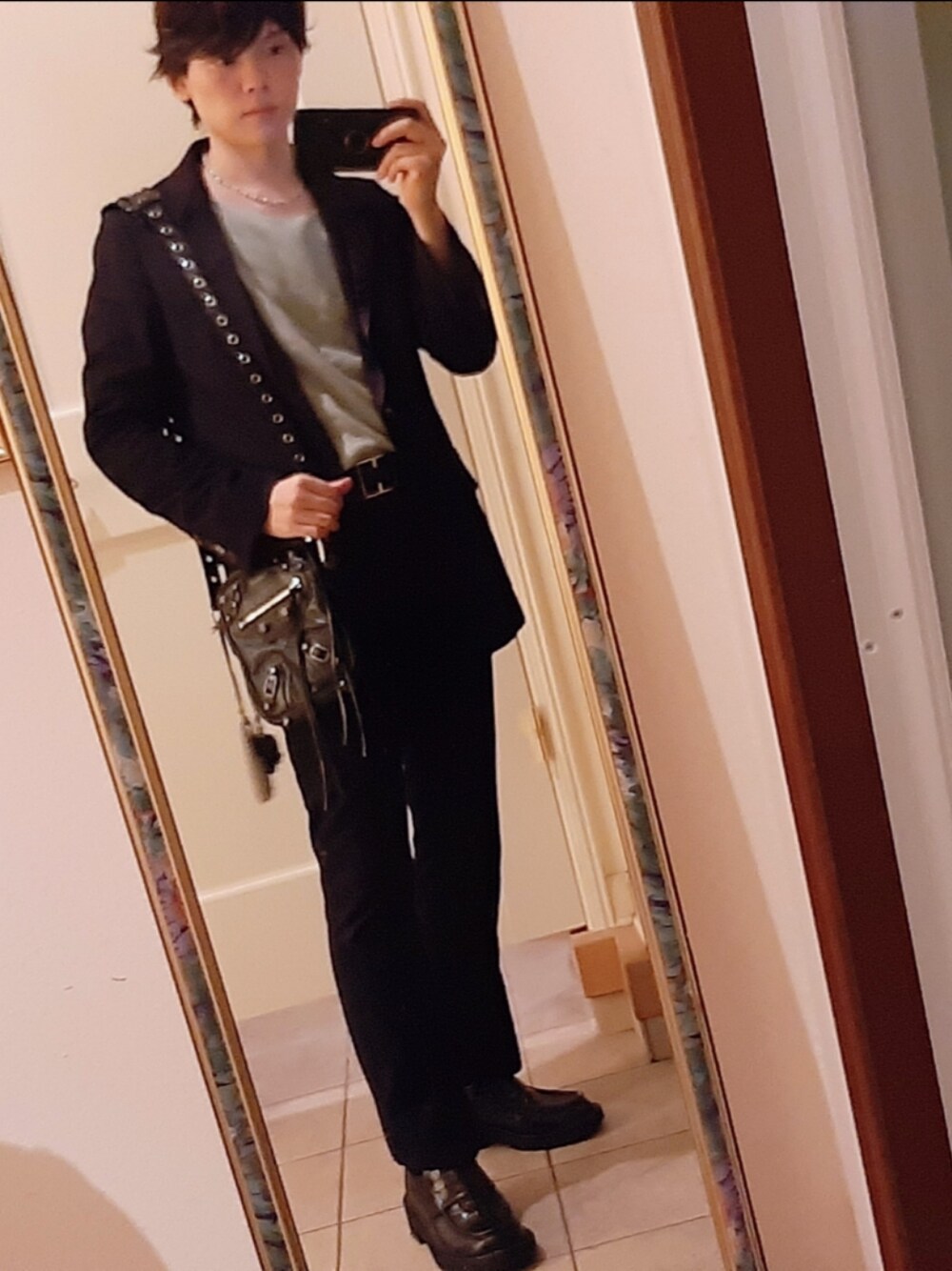 ブラックのセットアップにアクセントになってくれるバレンシアガのミニバッグ。 単品で見るとだいぶ派手ですが、意外とコーディネートに馴染んでくれるので重宝しています。 スタッズデザイン含めて、派手になりすぎない感じは流石のバレンシアガですね