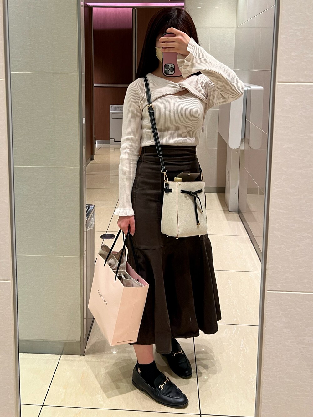 冬はニットばっかりだったから急に暖かくなると着る服がなくて困る( ˙-˙ ) chicoのトップスお気に入り!ちゃんとスカートにインすればよかった〜 スカートはシルエットが好みすぎて3色買ったけどブラウンが色も生地感もお気に入りです 紙袋になんでもぶち込みすぎている