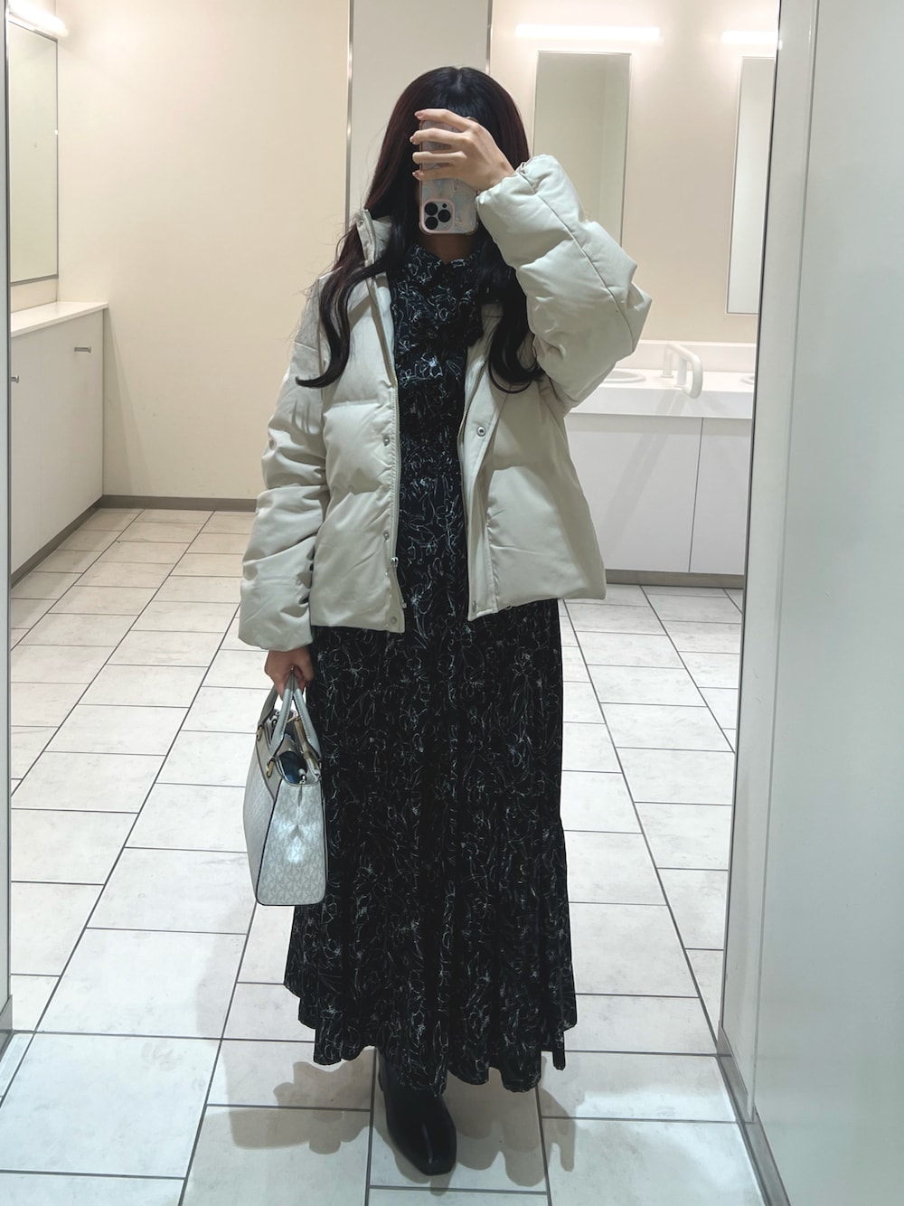サッと着るだけでなんか綺麗めな感じになるワンピ👗 寒すぎてダウン合わせちゃったけどファーアウターだともっと可愛いです!