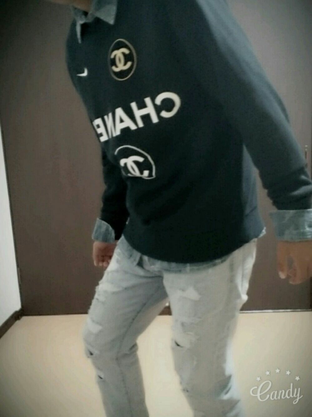 🌸お花見コーデ🌸 もう少しで桜が満開になると言うことでお花見コーデをしてみました!! スウェットはエヴァネッスのナイキとシャネルのパロディスウェットを使いストリート感を出してみました😤😤 そしてデニム生地のシャツとデニムパンツで春らしさをだしました! アドバイスがあればどんどんコメントお願いします! good&followもお願いします