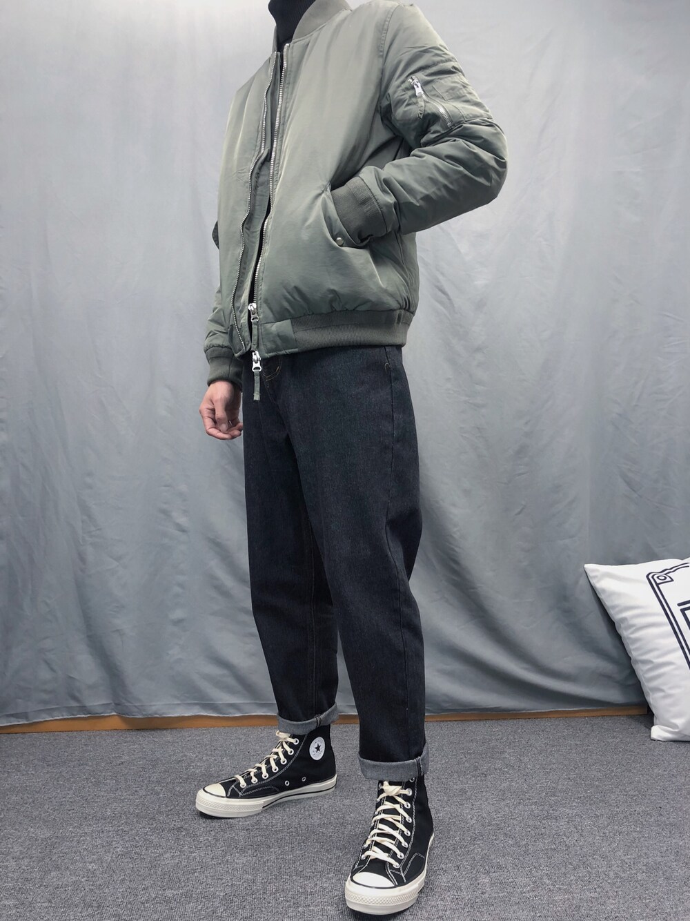 高领毛衣+飞行员夹克棉衣+直筒丹宁裤+高帮帆布鞋 nice