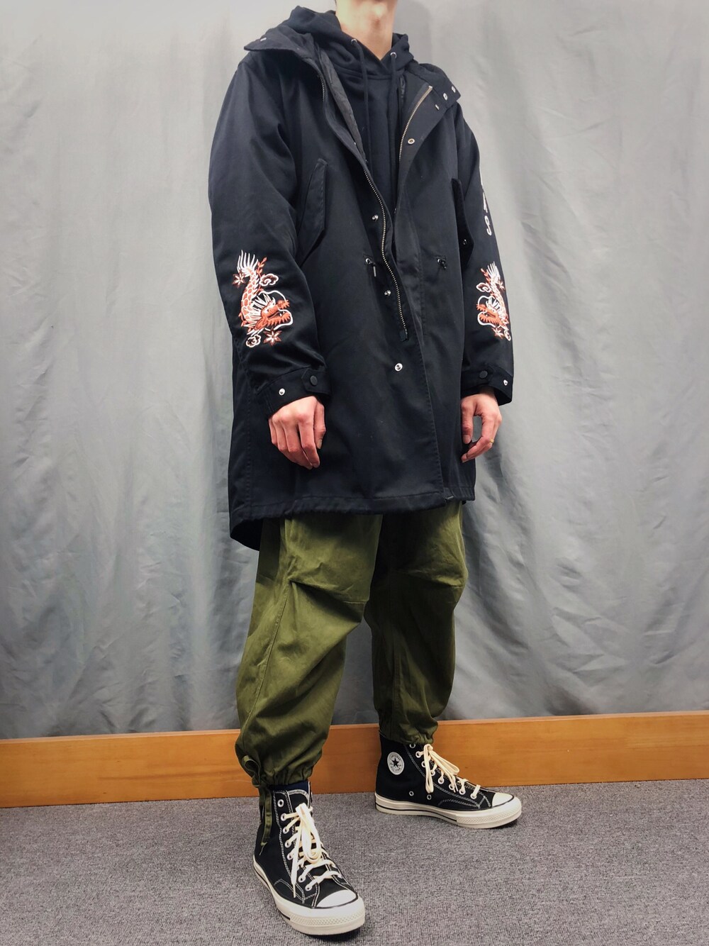 ブラック系のスニーカーを着用したメンズの冬コーディネートの1枚目の写真