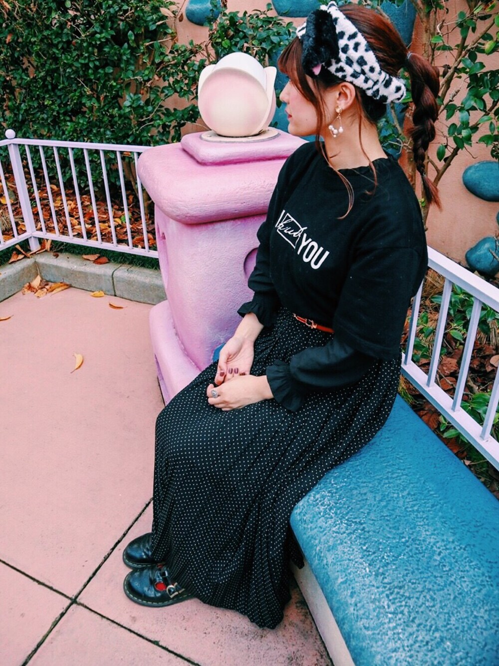 このまえディズニーいったときの。 オールブラック😈大好きなベボベのTシャツきていきました。