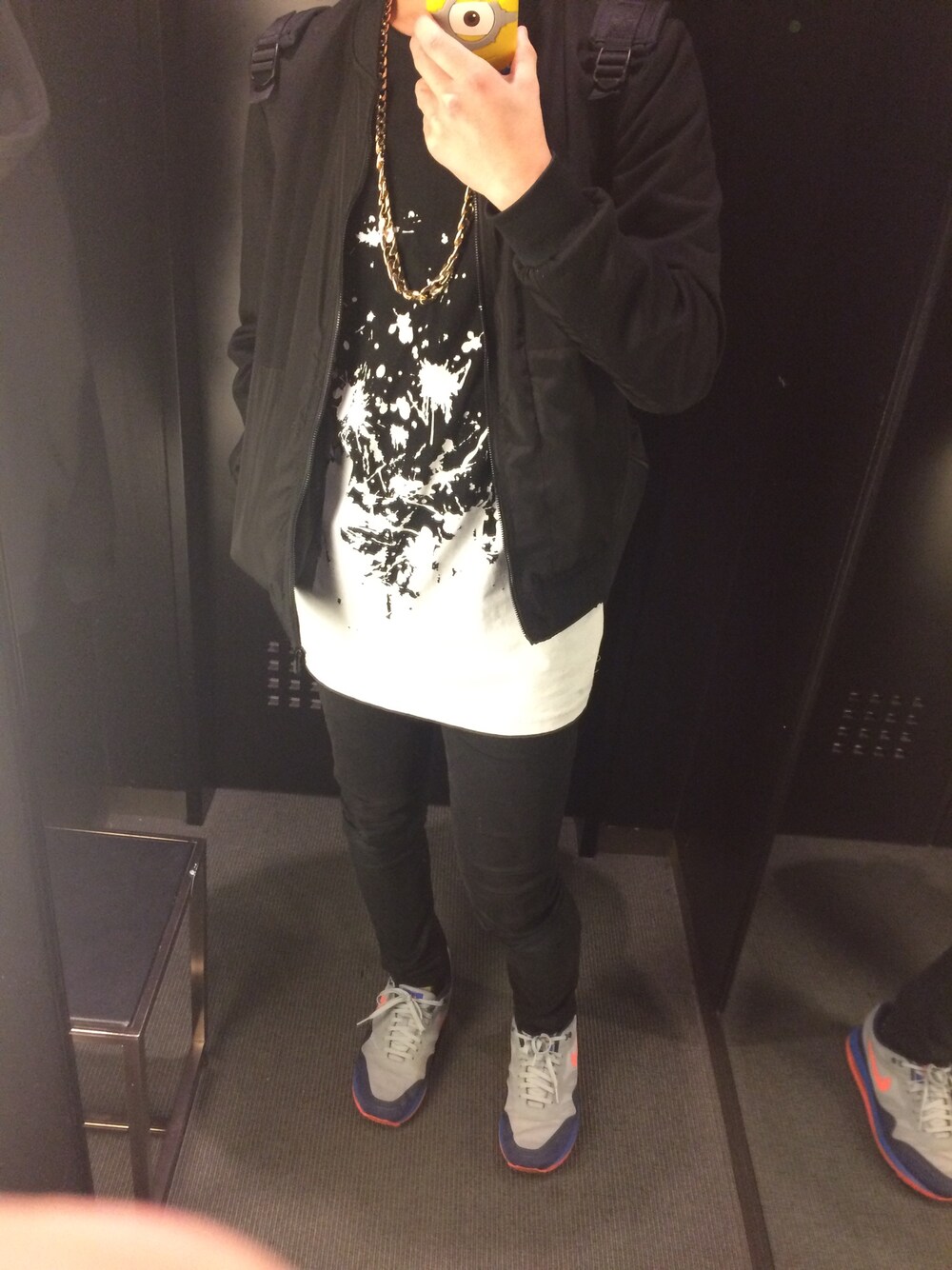 モノトーンでストリートでキレイめのコーディネートです。 アクセントでスニーカーは色味があるエアマックスにしました! エアマックスは90です MA-1はZARAでとても安く売っていたので買いました ペンキTシャツは安定のmonomania インナーはH&Mです H&M安くてとても便利ですね。 お正月でも全然寒い感と感じる天気ではほとんどないのでこんな感じでも寒さはとくにないです